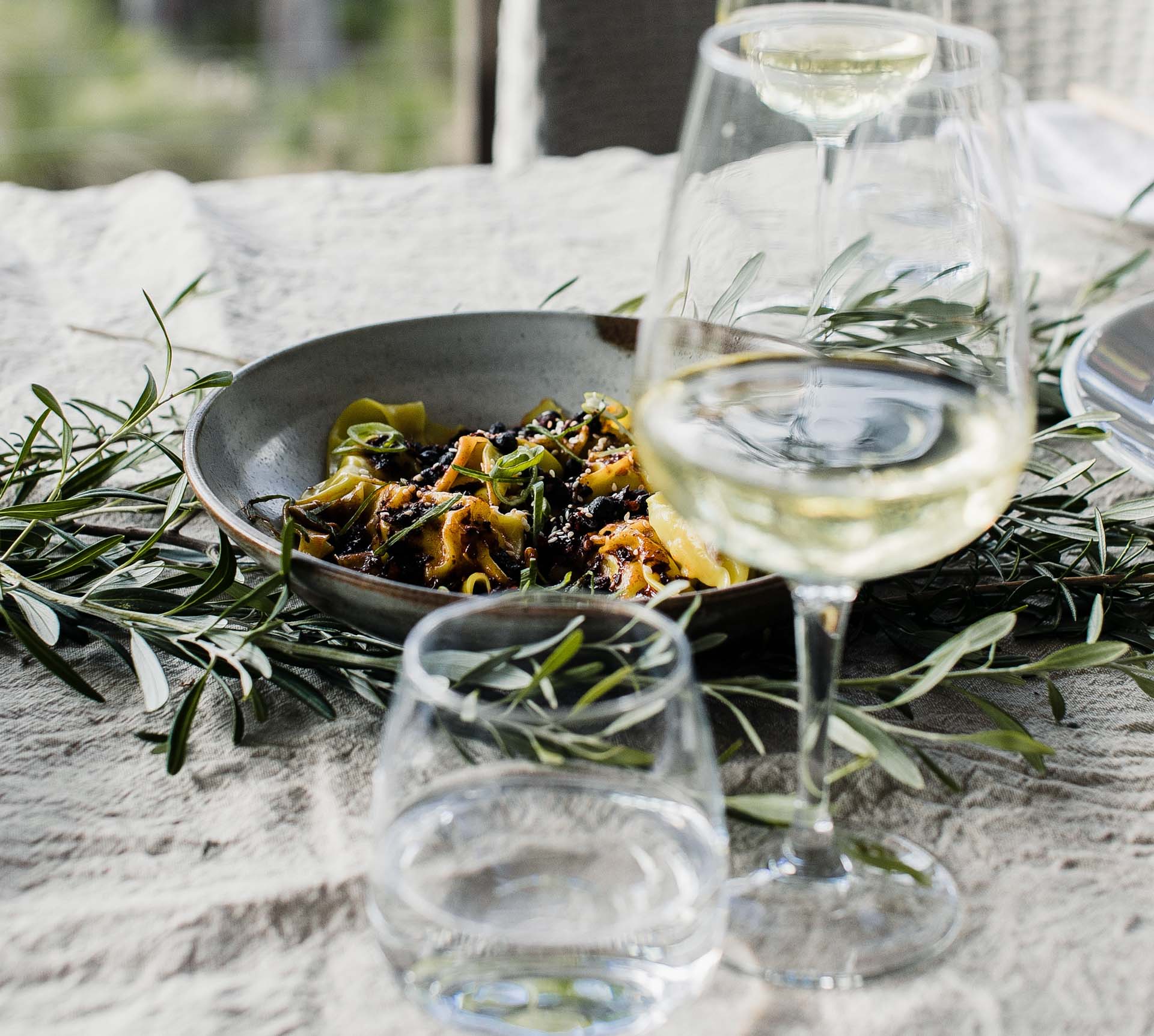 Gyoza de verduras, tofu y setas con Javier Ruíz sobre lías 2021, de Bodegas Javier Ruíz