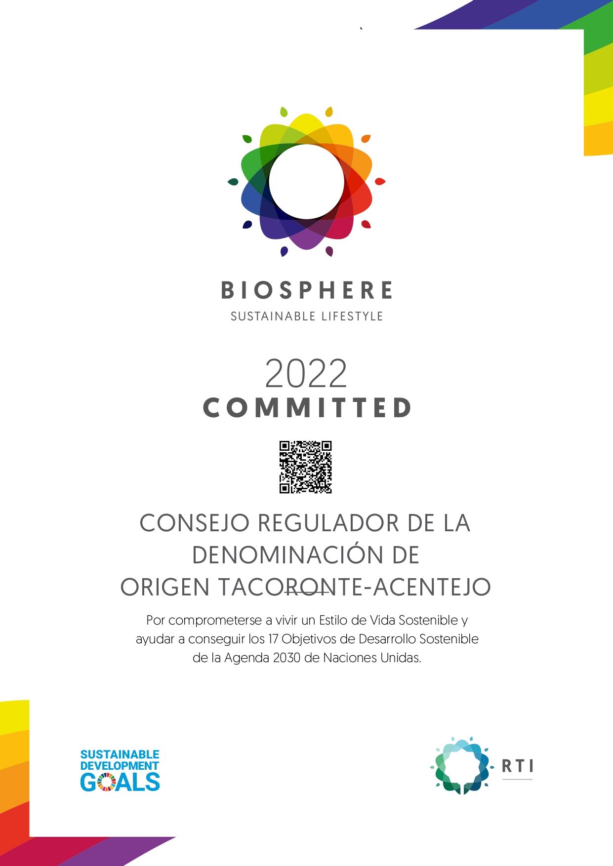 El Consejo Regulador de la Denominación de Origen Tacoronte-Acentejo ha obtenido el certificado Biosphere Sustainable Lifestyle Commited, por comprometerse con la sostenibilidad y contribuir a la obtención de los objetivos de Desarrollo Sostenible.  Este es un primer certificado de compromiso pero el Consejo Regulador sigue trabajando en el desarrollo sostenible y en la consecución del Biosphere Certified. Este último es el que demuestra que verdaderamente se está actuando y participando en la consecución de los objetivos de sostenibilidad. Para ello se necesita la implementación de nuevos objetivos sostenibles que se espera sean alcanzados en el corto plazo.