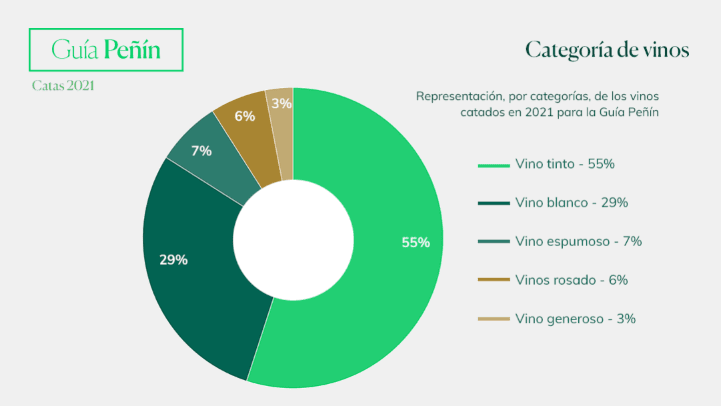 Por categorías, los tintos vuelven a suponer el grueso de la guía, con un 55 % de los vinos catados. Por detrás, se sitúan los blancos (29%), seguidos de los espumosos (7%), los rosados (6%) y los generosos (3%).