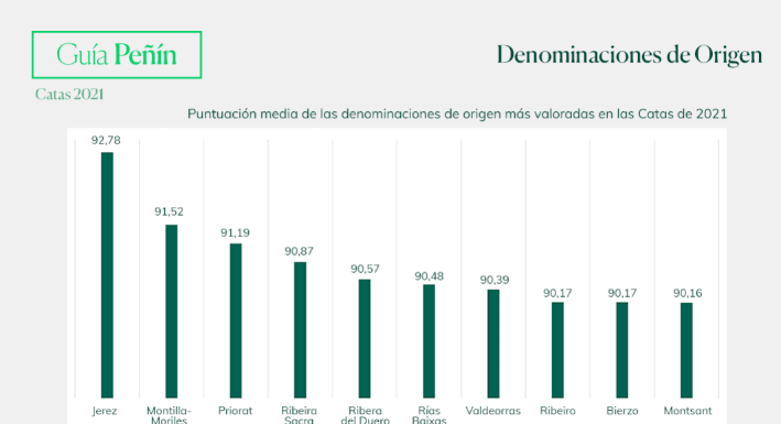 Jerez lidera un año más el ranking de denominaciones de origen, siendo la más valorada con 92,78 puntos de media, seguida de Montilla-Moriles (91,52 puntos), Priorat (91,19), Ribeira Sacra (90,87), Ribera del Duero (90,57), Rías Baixas (90,48), Valdeorras (90,39), Ribeiro (90,17), Bierzo (90,17) y Montsant (90,16).